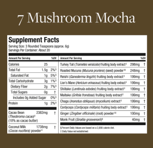 Our 7 Mushroom Mocha ™ supports balanced energy and mental clarity with a rich, creamy mocha taste.* Featuring a powerful, synergistic blend of organically-grown mushroom fruiting body extracts and blended with cacao and coconut, this delicious functional powder promotes healthy, resilient energy and focus all day long.*