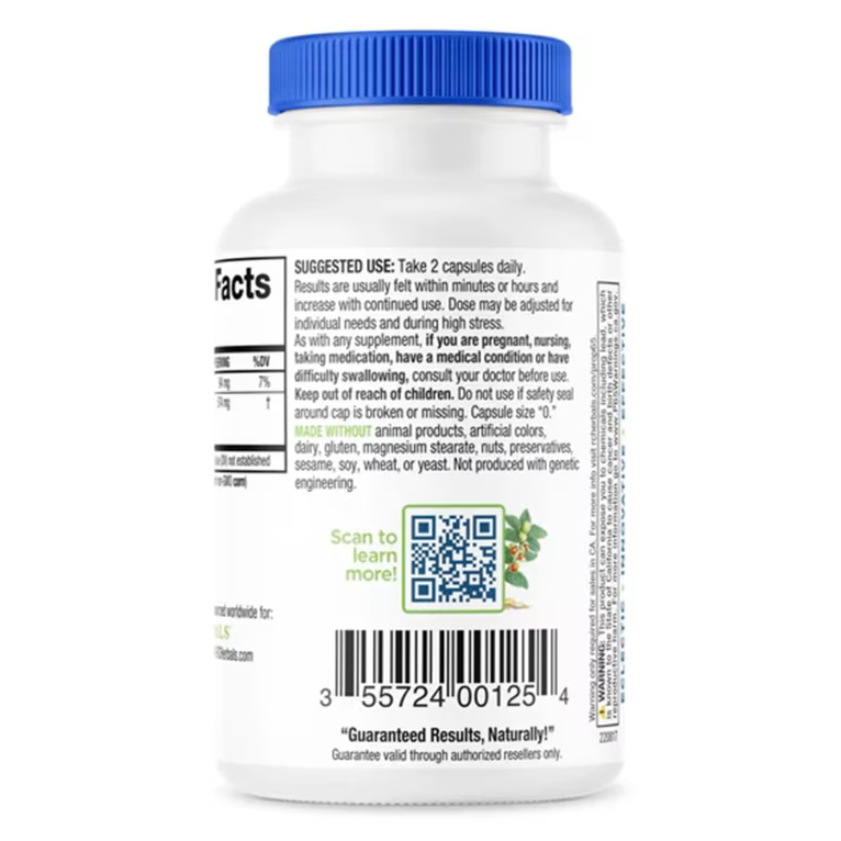 MADE WITHOUT animal products, artificial colors, corn, dairy, gluten, magnesium stearate, nuts, preservatives, sesame, soy, wheat, or yeast. Not produced with genetic engineering.